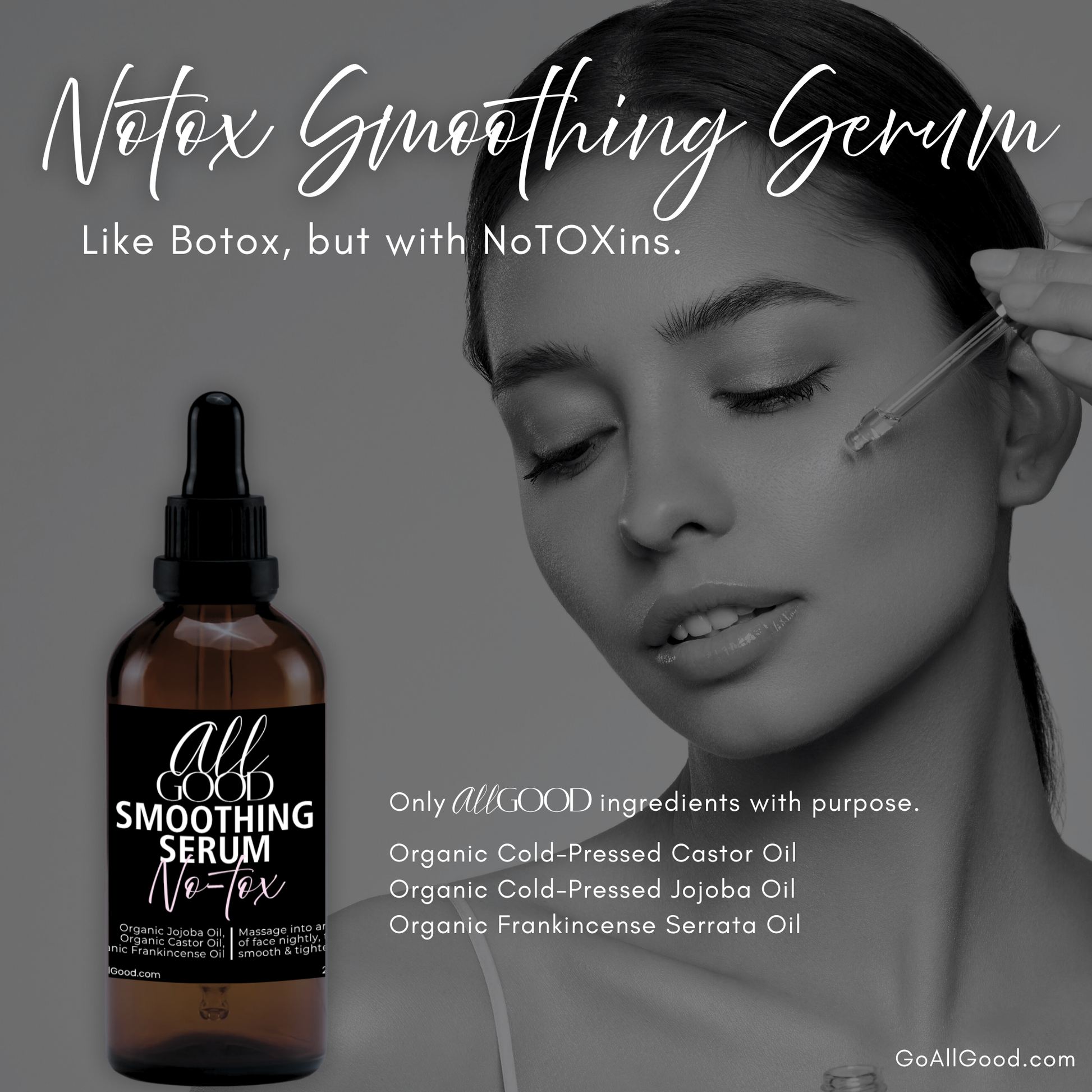 Notox Smoothing Serum offers a natural alternative to Botox, but with zero toxins—“NoTox.” Crafted with all-natural, All Good ingredients, it rejuvenates, hydrates, and balances your skin. Packaged in an amber glass bottle with a glass dropper for easy application.